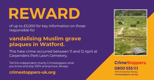 Crimestoppers is offering a reward of up to £5,000 for information leading to the arrest and conviction of those responsible for the recent vandalism of Muslim grave plaques at Carpenders Park Lawn Cemetery in Watford. This deeply troubling incident occurred between 1pm on Friday, 11 April, and 5pm on Saturday, 12 April, and has affected numerous plaques commemorating the graves of babies and young children.