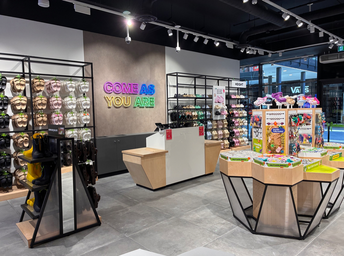 Celebrating individuality and inclusivity, the new CrocsTM store proudly displays the Come As You AreTM brand statement in glowing LED lights, adding a personal and inspiration touch to the space.
