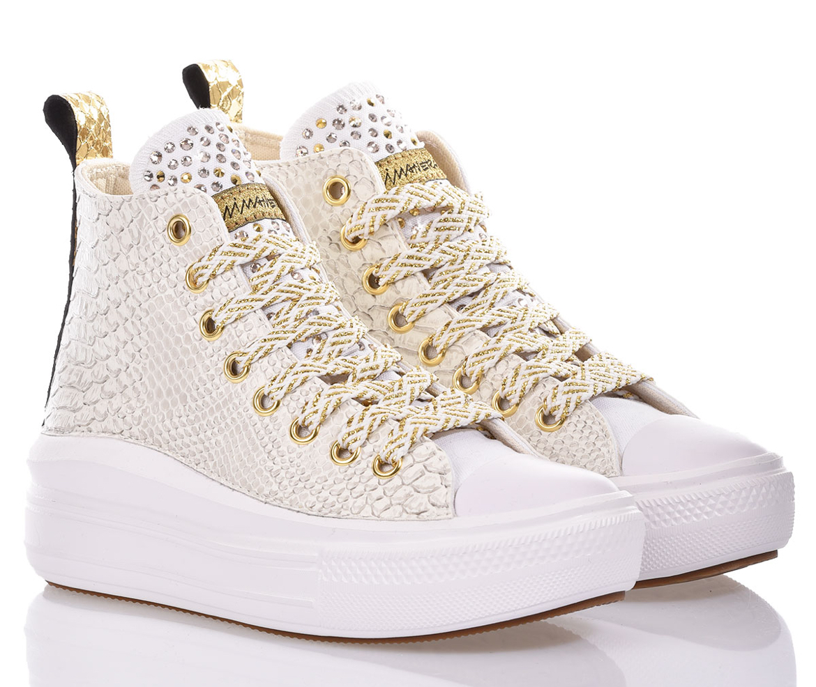 The sneakers offered by Mimanera transform into true works of art to wear, thanks to the contribution of a talented creative team. Among the many customisation options, customers can benefit from rhinestones, studs, laminated fabric, glitter, or Swarovski. It’s also possible to add other decorations or special laces to make the shoes truly unique.