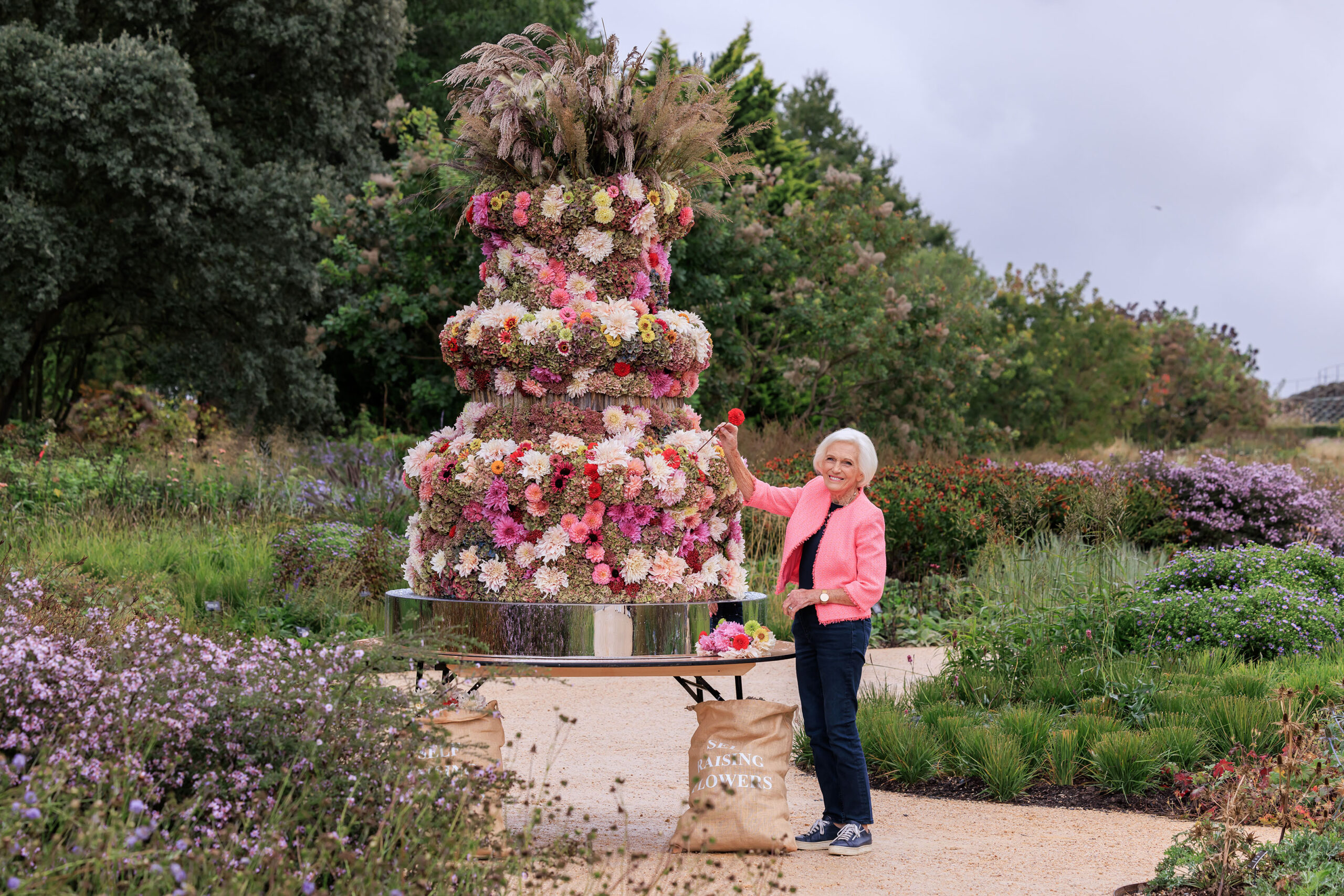 Mary Berry placed the final flourishes of ‘self-raising flower’ on top of a 1.5m floral cake, with over 1,000 blooms including seasonal stems of British hydrangea, dahlias, seedum and zinnias. The celebratory floral ‘cake’ has been designed and created by one the country’s best known and admired florists – Simon Lycett, which as well as including colourful seasonal foliage and flowers, all of which have been sustainably arranged, has a selection of plants that celebrate the borders and Piet Oudolf’s known love of plants such as achillea and echinacea.