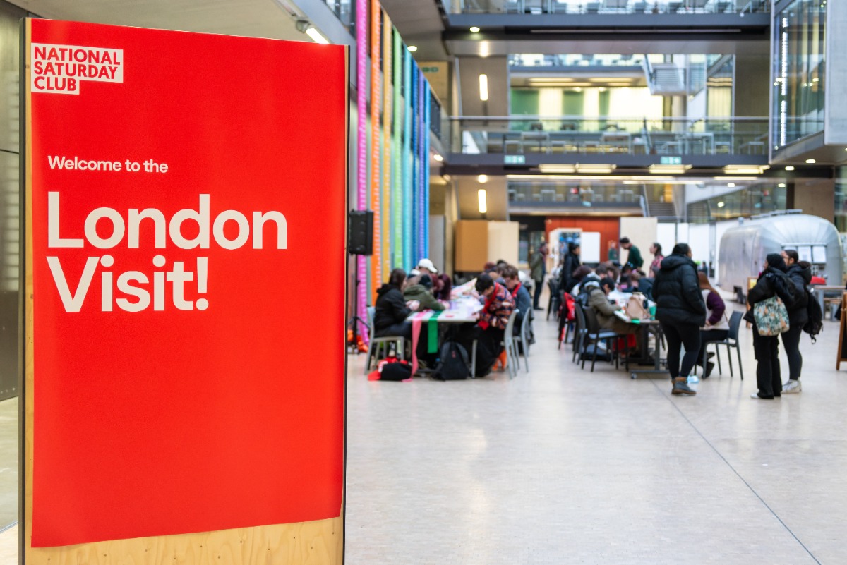 The London Visit is the National Saturday Club’s annual Autumn Term event, where hundreds of young people from Saturday Clubs across London and the south-east come together as a national network and visit leading museums, galleries and performance spaces across the capital.The Visit at Central Saint Martins. A sign that says Welcome is shown with people in the background