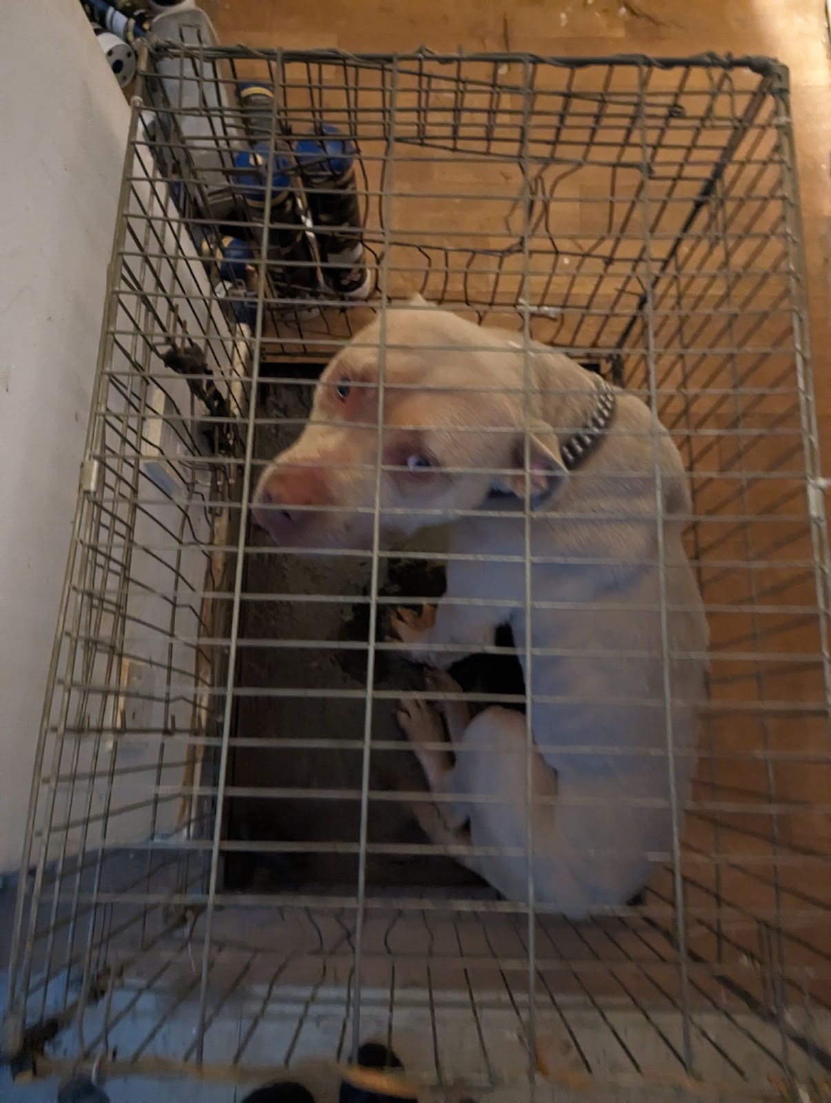 “Some of the bars of the cage were bent as if chewed, and I did observe Nipsy frantically chewing at the bars while whining. There was also a hole in the front of the crate – possibly made by the dog – which he was trying to stick his head through. There was no bedding, food or water available in the crate.”