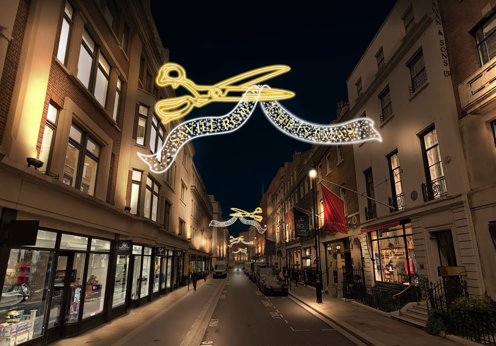 Savile Row, the world-renowned bespoke tailoring district in the heart of Mayfair, is debuting its new Christmas lights on Thursday, 16th November. The Christmas lights have taken inspiration from iconic tools found in every tailor’s workshop: a pair of shears. The giant illuminated golden shears are seen cutting through a glittering pealight swathe of ‘fabric’, with the message of ‘Savile Row Christmas’ twinkling against the winter sky. The shears represent some of the key values of Savile Row – craftsmanship, skill and knowledge. For the first time ever, these new festive lights will illuminate The Row, from the corner of Clifford Street and finishing on the corner of Burlington Gardens, adjacent to the Royal Academy of Arts.