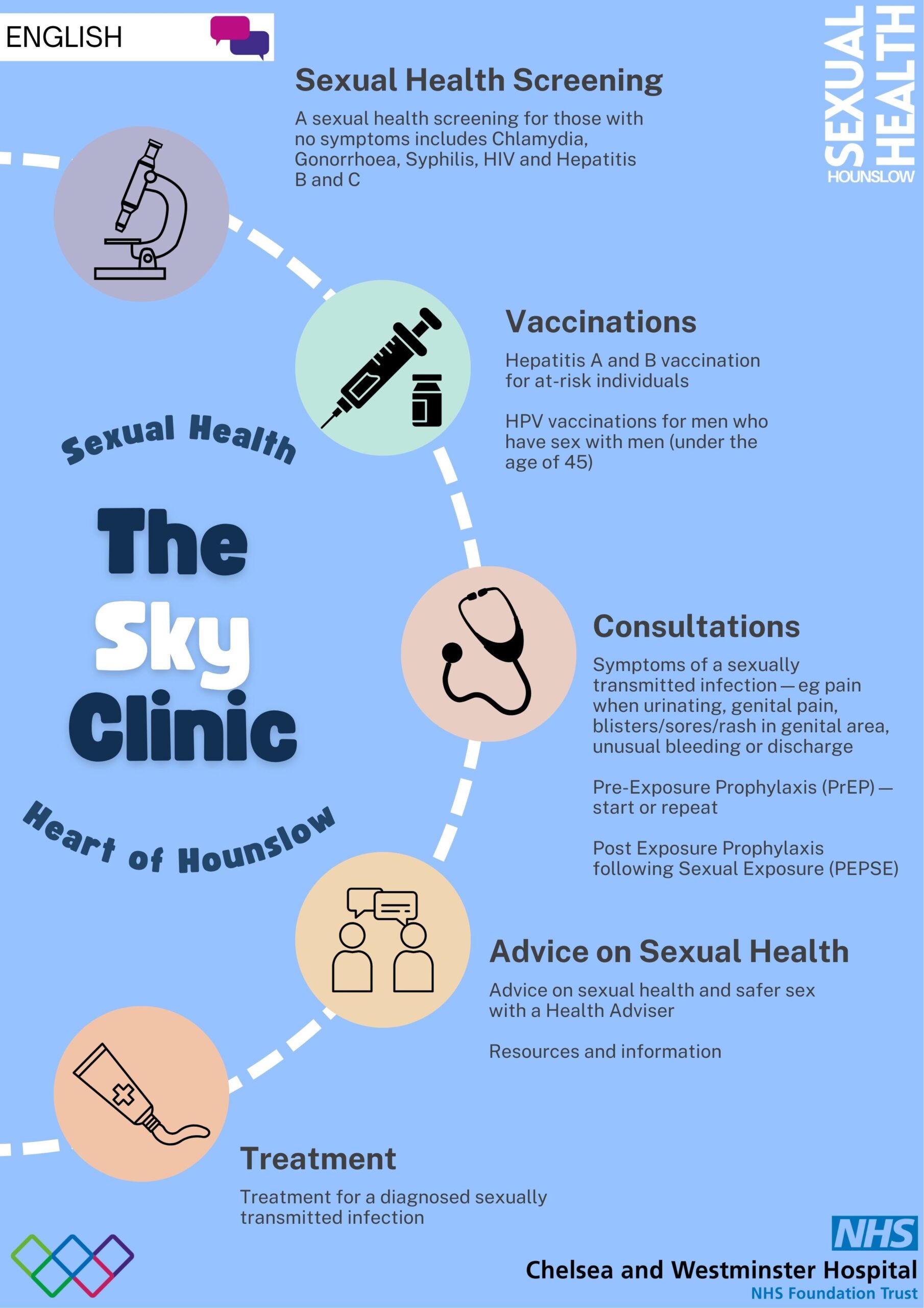 The Sky Clinic, run by Sexual Health Hounslow (SHH), part of Chelsea and Westminster Hospital NHS Foundation Trust is a one-stop clinic to provide healthcare advice, treatment and support specifically for men who have sex with men (MSM), transgender women, and gay and bisexual men.