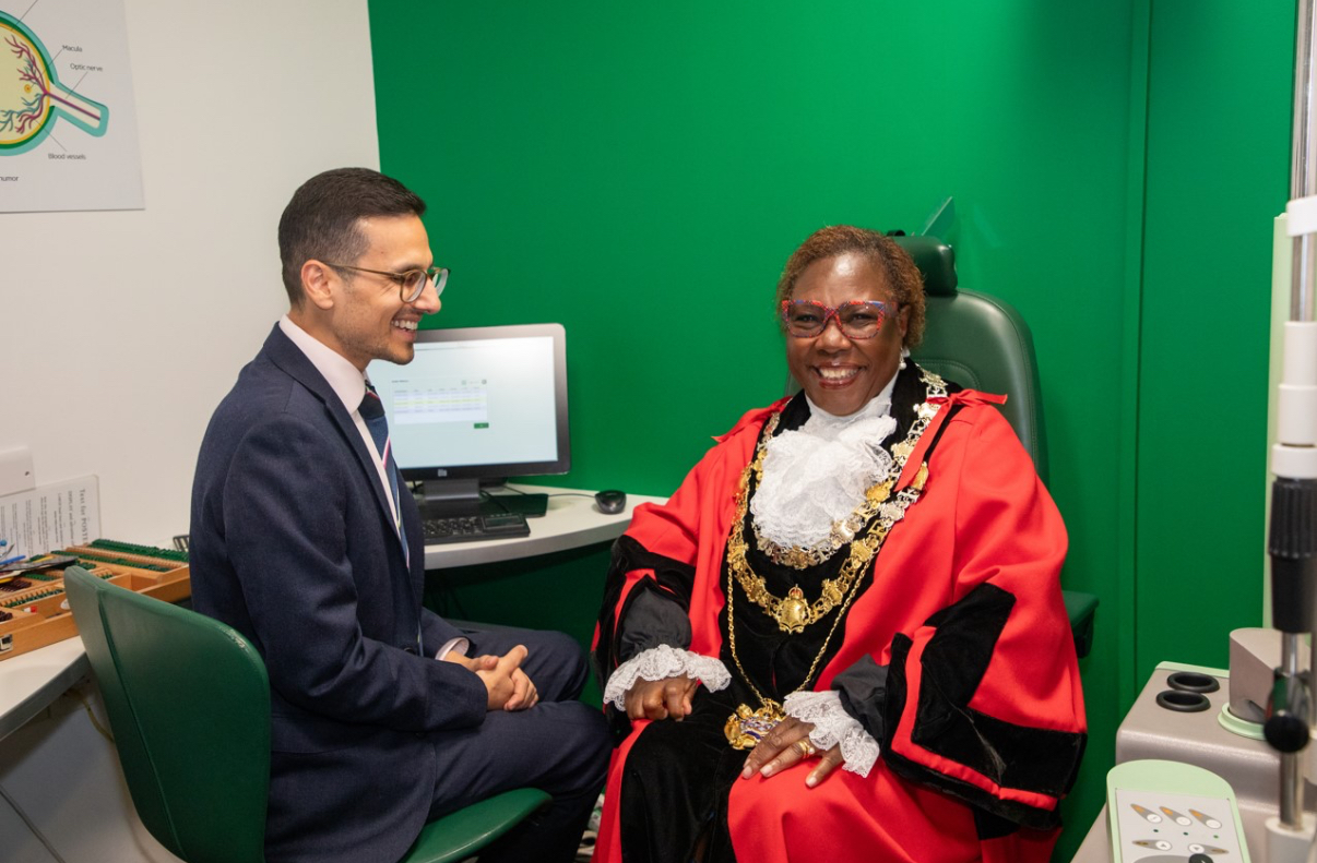 To mark the occasion, the Mayor gave a short speech and cut the celebration anniversary cake. This was followed by a toast to many more years of providing the Fulham community with excellent healthcare services. After the formal celebrations had concluded, Councillor Holder had a sight test with Nimesh Modi.