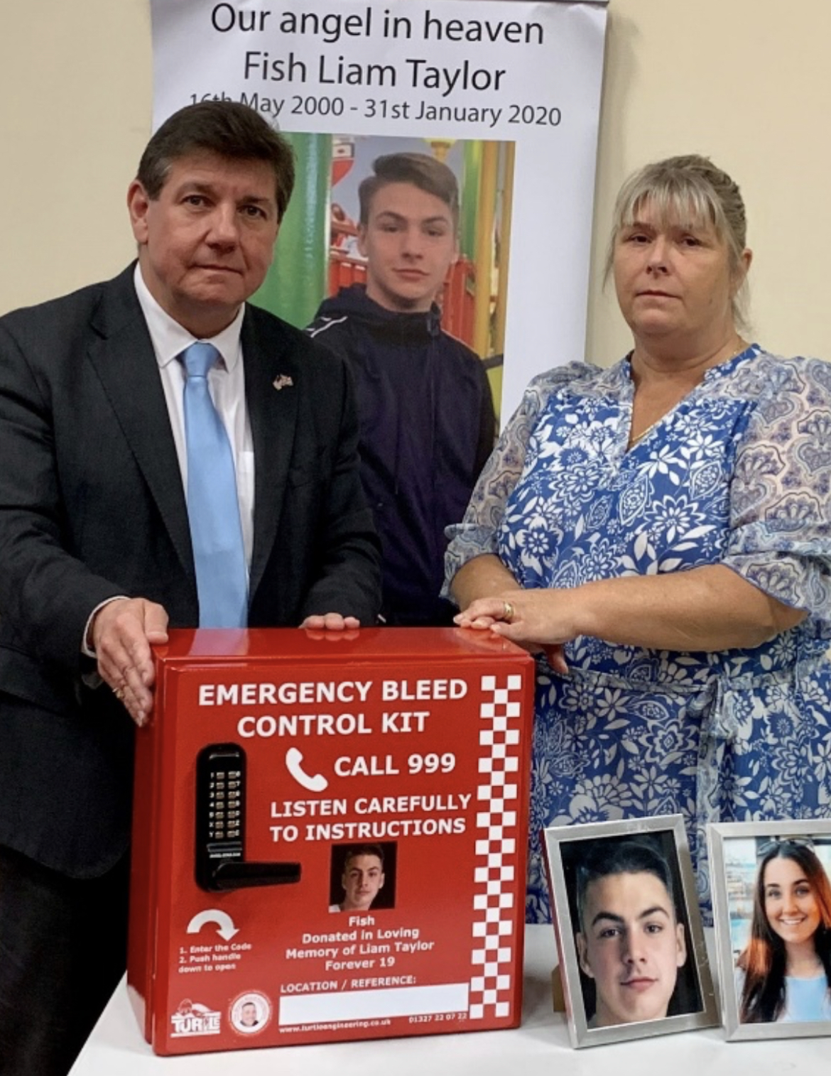 Mrs Taylor has led a fundraising campaign for public-access bleed control kits which contain a tourniquet, bandages and foil blanket. Through “The Liam Taylor Legacy” crowdfunding page, bleed control kits have been funded and installed at venues across Essex.