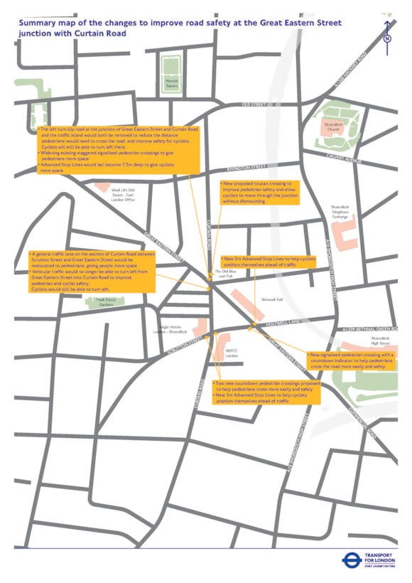 TfL is also inviting residents to give initial thoughts on improving road safety at the junction of Shoreditch High Street and Great Eastern Street. A significant number of people have been injured at the junction and TfL is designing proposals to improve safety in the area. TfL will use any feedback received to help develop a more specific set of proposals for improvements to the junction. A further consultation will be held in 2025 with more details on proposed improvements for the junction.