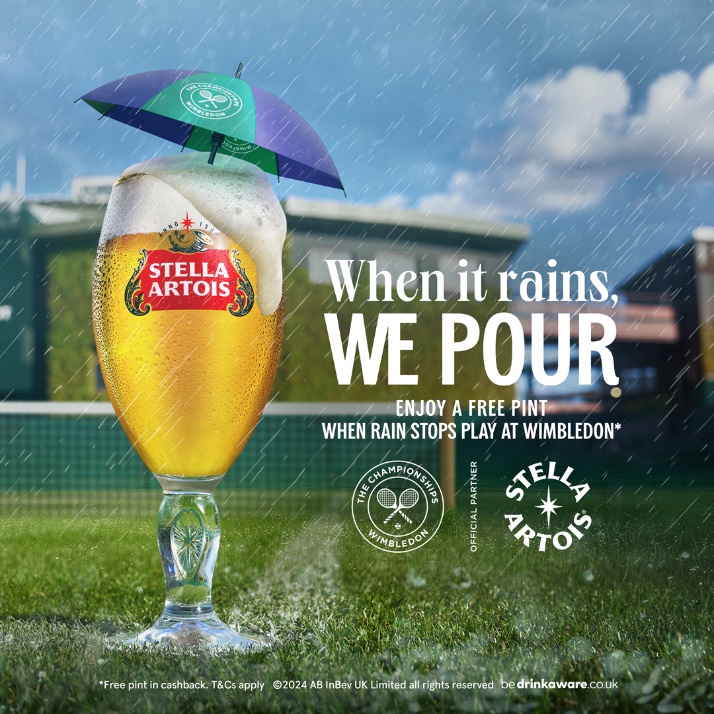 When the court covers come on at the Wimbledon Championships, Stella Artois will cover the cost of up to 10,000 pints. The offer will be available at select participating pubs nationwide throughout the Wimbledon Championships (1st – 14th July 2024).